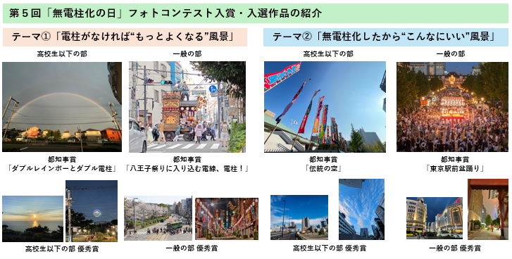 都民の皆様に無電柱化の効果を実感していただくことを目的として、「電柱がなければ“もっとよくなる”風景」や「無電柱化したから“こんなにいい”風景」についてフォトコンテストの作品を募集しました。