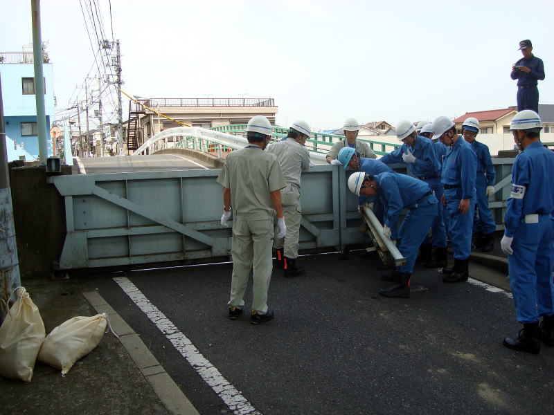 現在の水戸橋は橋桁の高さが低いため、橋梁横架部の護岸高が必要な高さを満たしておらず、洪水時には陸閘と呼ばれる両岸の橋の袂に設置したゲートを閉鎖して不足する護岸高の代替えとしています。また、左岸側橋台が河川に突出して川幅を狭めているため、流水の阻害となっています。水戸橋の架替工事は、この陸閘方式と流水の阻害を解消するための工事です。