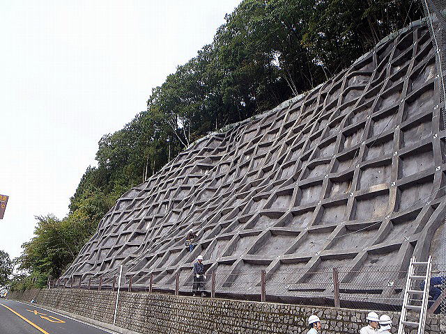 既存斜面の前面に鉄筋を網目状に配列し、その上からモルタル材を吹付ける工法です。また、法枠の交点にはロックボルト(鉄筋)を挿入し、既設斜面と密着させることで崩壊を防止しています。