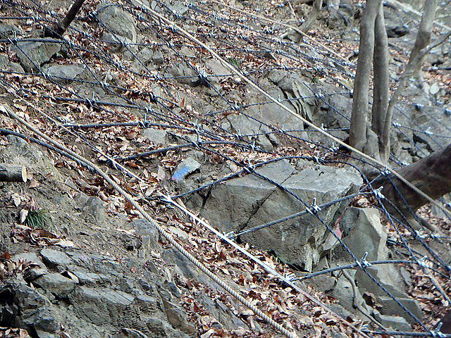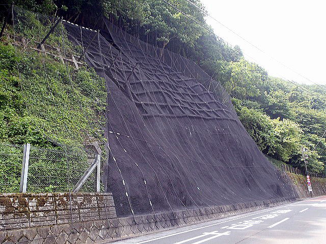 斜面内に存在する大きな転石や露岩を金属製のワイヤーで固定することにより、落石を予防します。