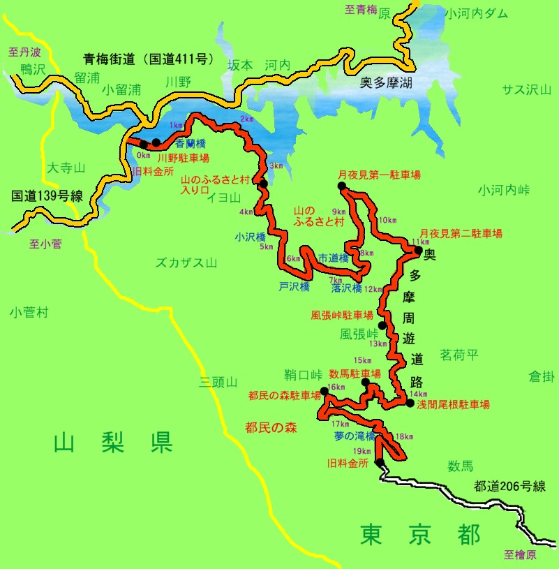 | 青梅IC | 奥多摩側 | 青梅市内を抜け、国道411号線→深山橋交差点を左折→国道139号線 | 約1時間20分 |