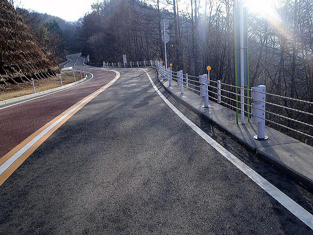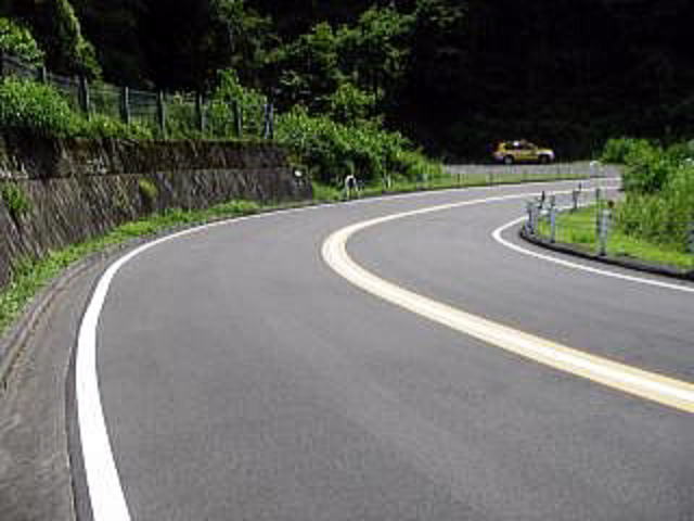 奥多摩周遊道路は急カーブが多く、、転倒事故やスリップ事故が発生しているため、安全対策として、滑り止め舗装を行なっています。