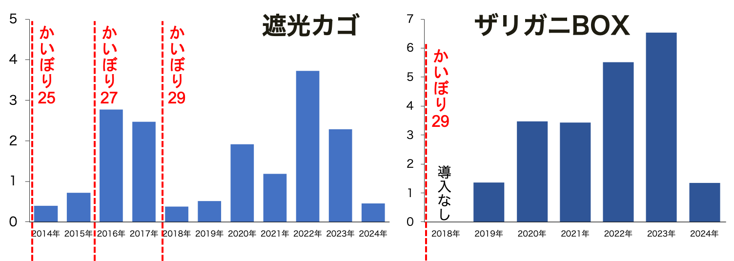 より捕獲効率のよいワナを導入するなど、試行錯誤しながら続けてきた防除活動や環境要因によってか、2024年はアメリカザリガニの生息密度が急減しました(図1)。