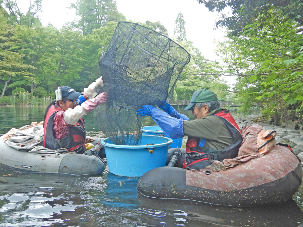毎年4月から10月まで、井の頭池ではアメリカザリガニ防除を行っています。2025年は池に計240基のワナを仕掛け、井の頭かいぼり隊が週1回ワナを確認しています。在来種は池に戻し、外来種は駆除します。