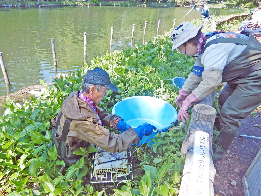井の頭池では2017年までに行った3回のかいぼりにより、肉食性のオオクチバスやブルーギルを根絶しました。一方でアメリカザリガニは、別の場所に移動したり、池干し中は泥の中に潜んだり等するため、かいぼりだけでは対処しきれません。そのため、かいぼり以降、地道に防除活動を進めています。[提供:井の頭かいぼり隊]