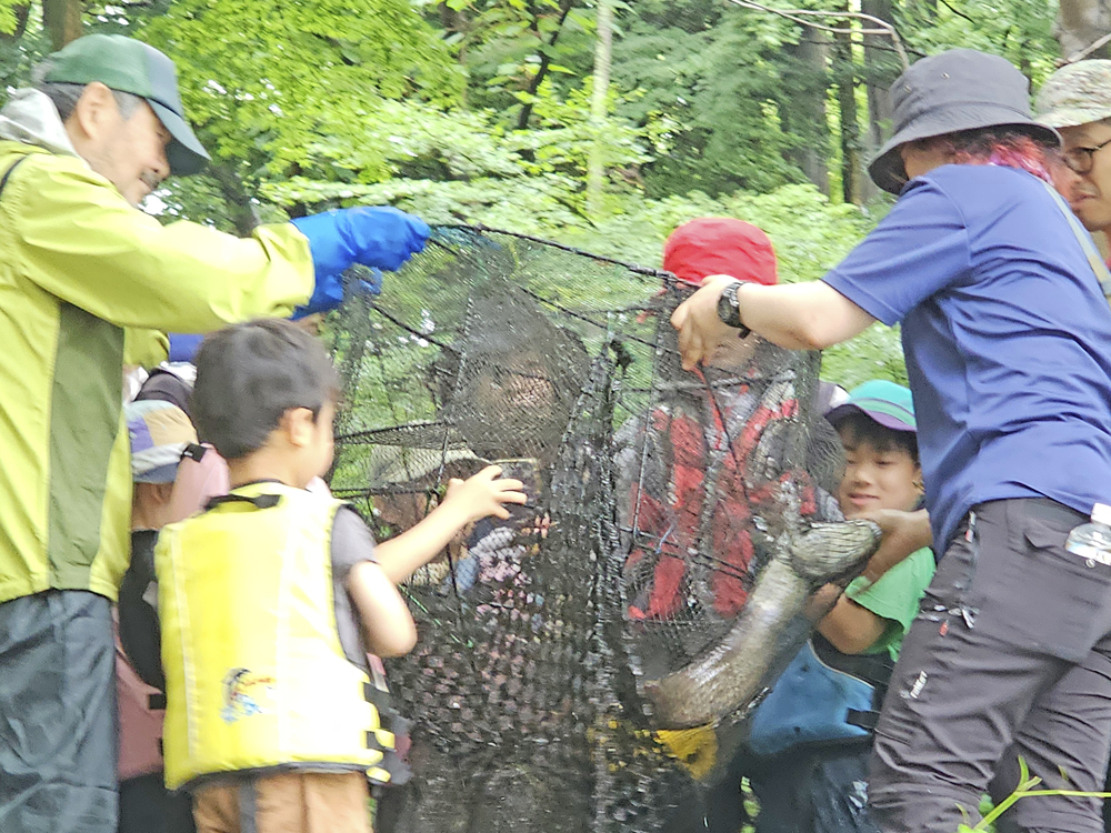 イベントでは、井の頭池のかいぼりで生きものや水辺がどう変化したかなどを解説し、実際に池からワナを引き揚げてとれたての生きものを観察します。