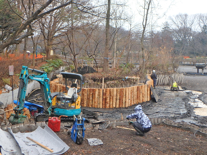 作業では、葦島内の水深が深い場所へ土を入れて、ヒタヒタの水深になるように調整しました。土は園内作業で発生したものを利用しています。土を入れた重たいソリは、木の板や竹をレールのように敷いて滑らせることで、あっという間に園路から島の目的地へ運ばれました。
