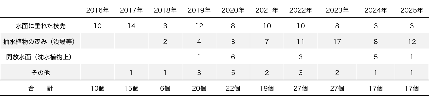 抽水植物が少なかった頃は主に水面枝で営巣していたカイツブリですが、抽水植物の茂みが拡がってくるとヒメガマやヨシに巣をつくるようになりました。2022年以降は水面枝の巣よりも抽水植物の茂みに多く営巣しています。水辺の自然再生の取組によって、浅場や抽水植物群落の手入れを行い、良質な環境が維持されている成果だと考えられます。
