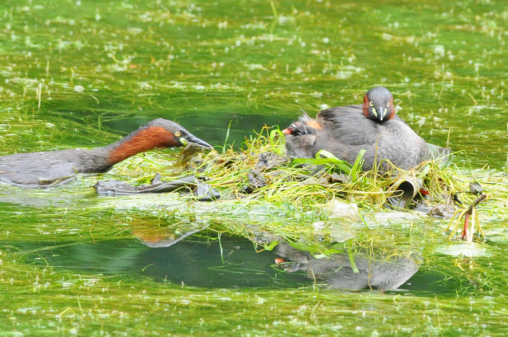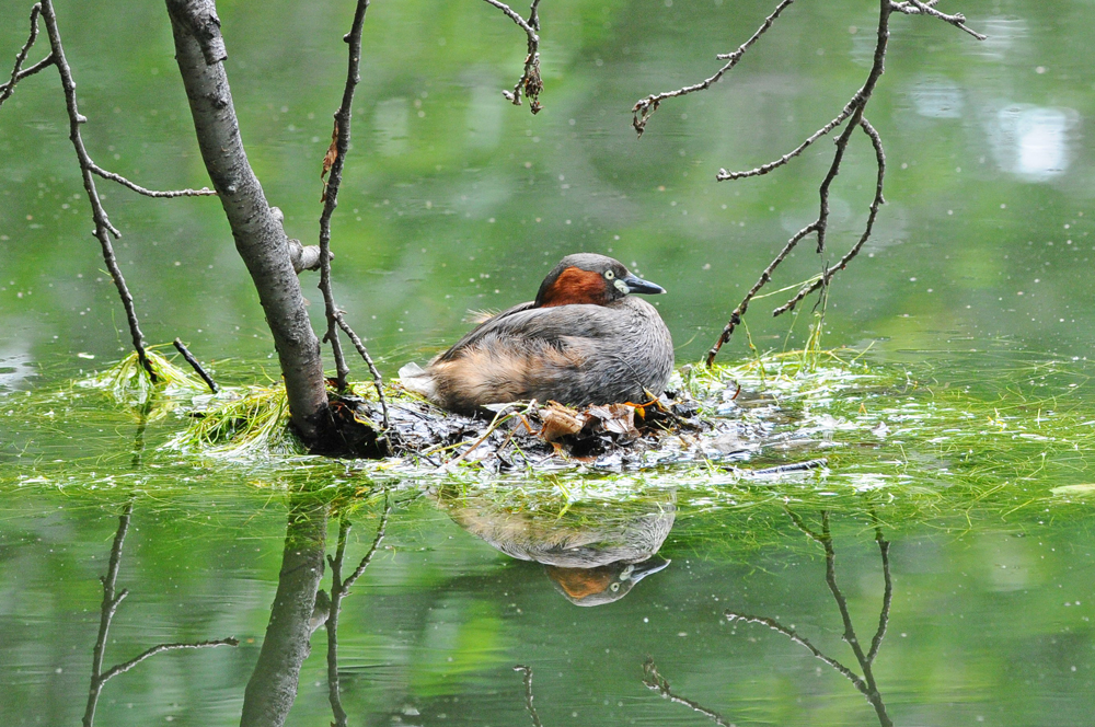 ほかにも、ツツイトモのような沈水性の水草が豊富な年は、水面に達した水草の上に浮巣をつくります。池の中にきらきらと水草が拡がり、その上でカイツブリが子育てをしている様子は何度見ても美しいものです。