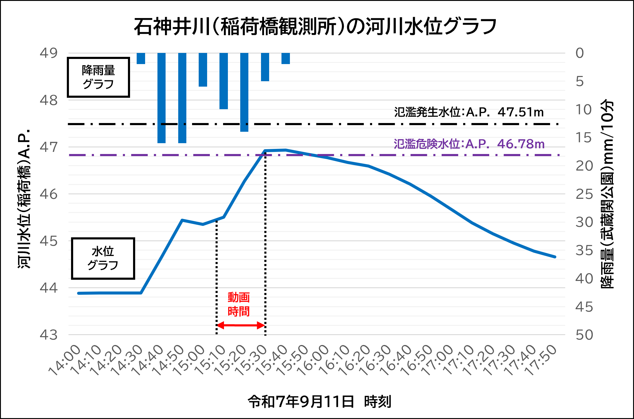 都内における時間最大雨量は、目黒区の工大橋観測所で時間最大134㎜/h、石神井川では武蔵関公園観測所で時間最大67㎜/hを記録しました。