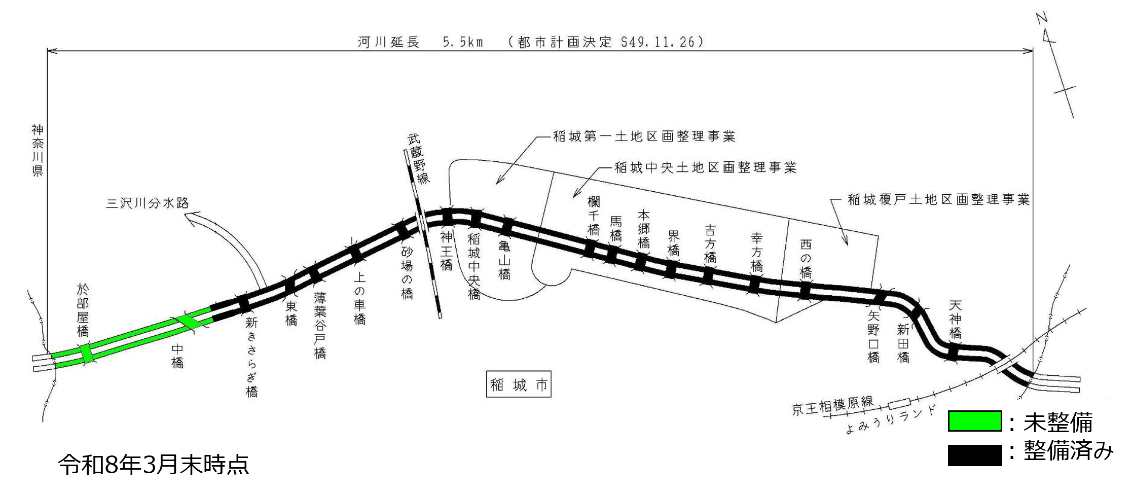 三沢川では、未改修区間について、稲城市の土地計画など周辺の開発に合わせて、1時間あたり50ミリの降雨により発生する洪水を河道により安全に流下させるため、護岸改修、河道掘削及び橋梁架替等を実施しています。