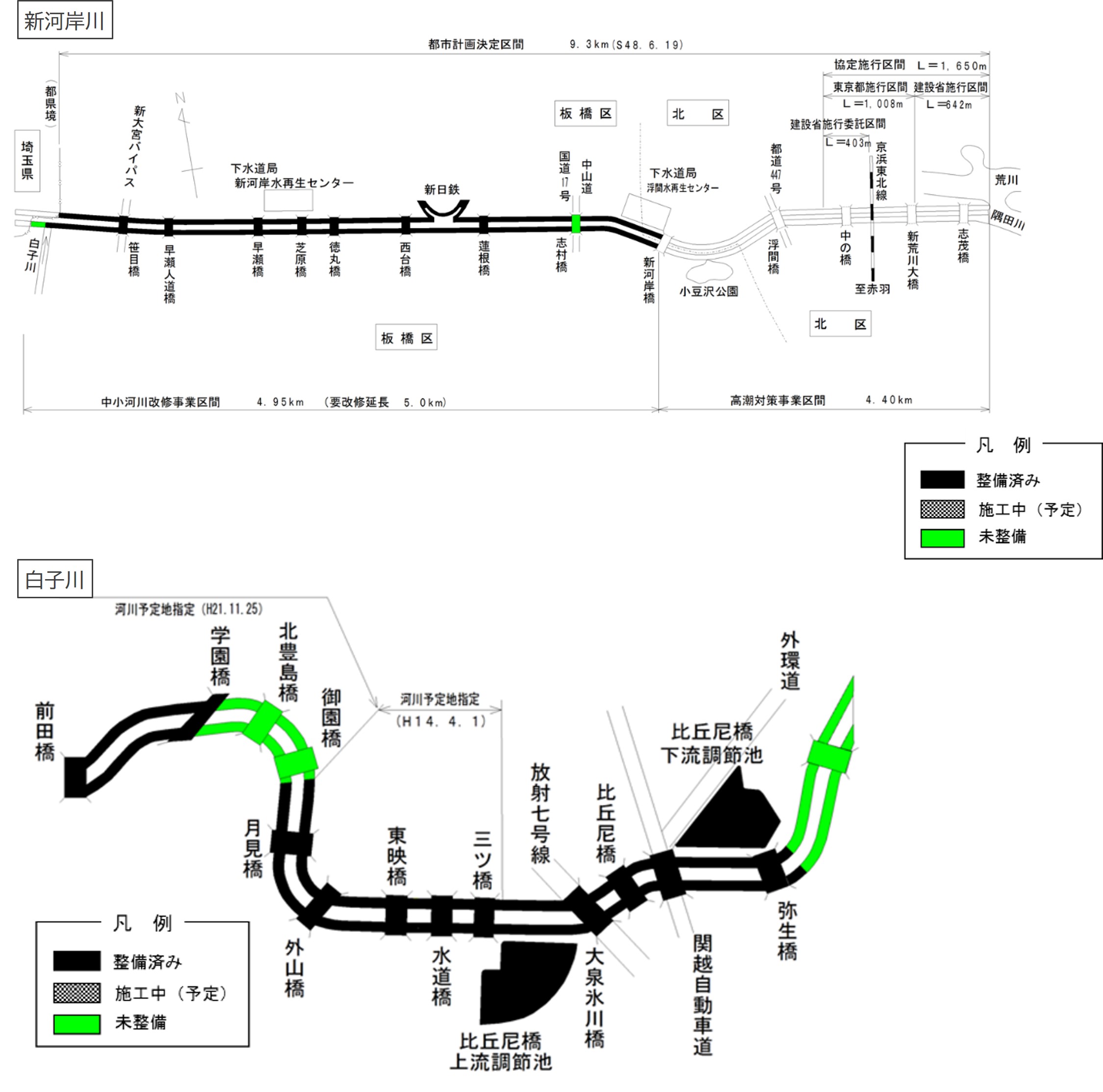新河岸川では、未整備箇所において、護岸の築造、背面盛土、管理用通路の整備並びに橋梁の架け替えなどを行います。