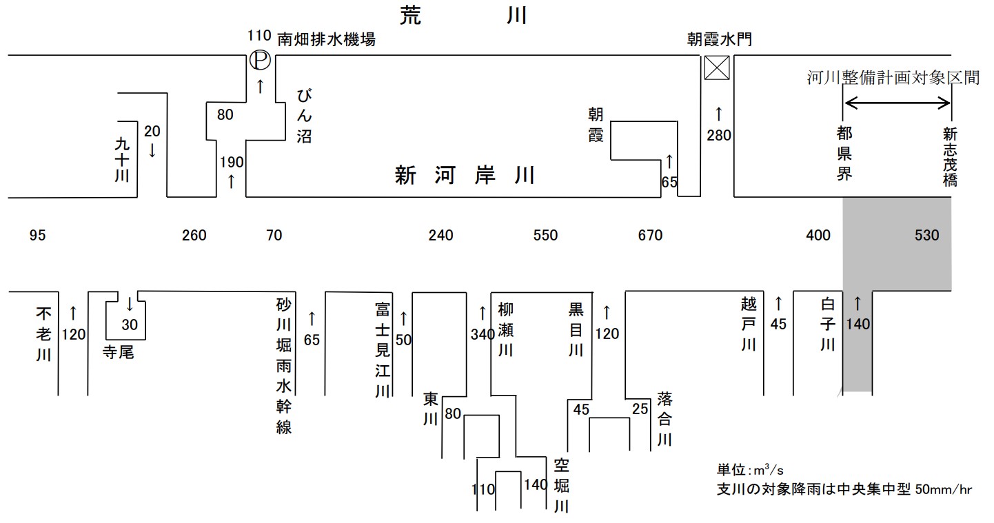 新河岸川流域では、新河岸川流域全域の計画である「新河岸川流域整備計画」に基づき、河川施設及び流域対策により昭和57年9月実績降雨(245.7mm/2day)規模により生じる洪水に対応することを目標としています。