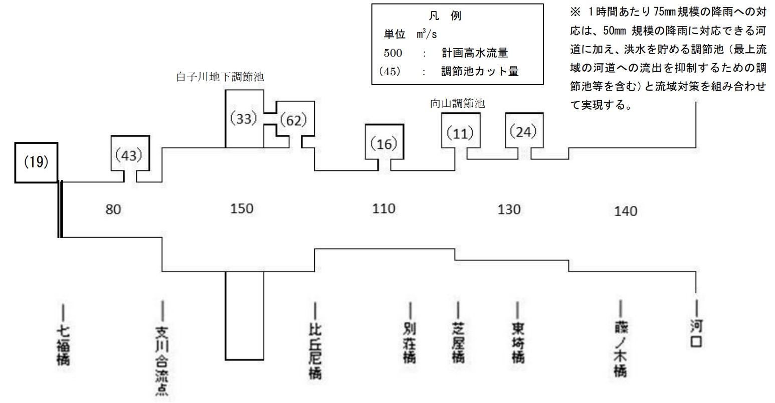 白子川流域では、治水安全度を早期に向上させるために、比丘尼橋上流調節池(34,400m3)、比丘尼橋下流調節池(212,000m3)、白子川地下調節池(212,000m3)が供用開始しています。