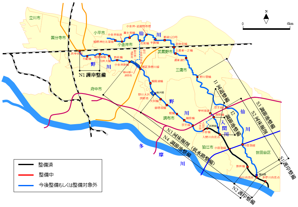 なお、野川及び仙川における護岸整備実施済の一部区間では、最下流部の整備状況に応じ、計画の河床高まで掘削せず、暫定的な深さに留めていたことから、引続き、河床掘削を行うこととしています。