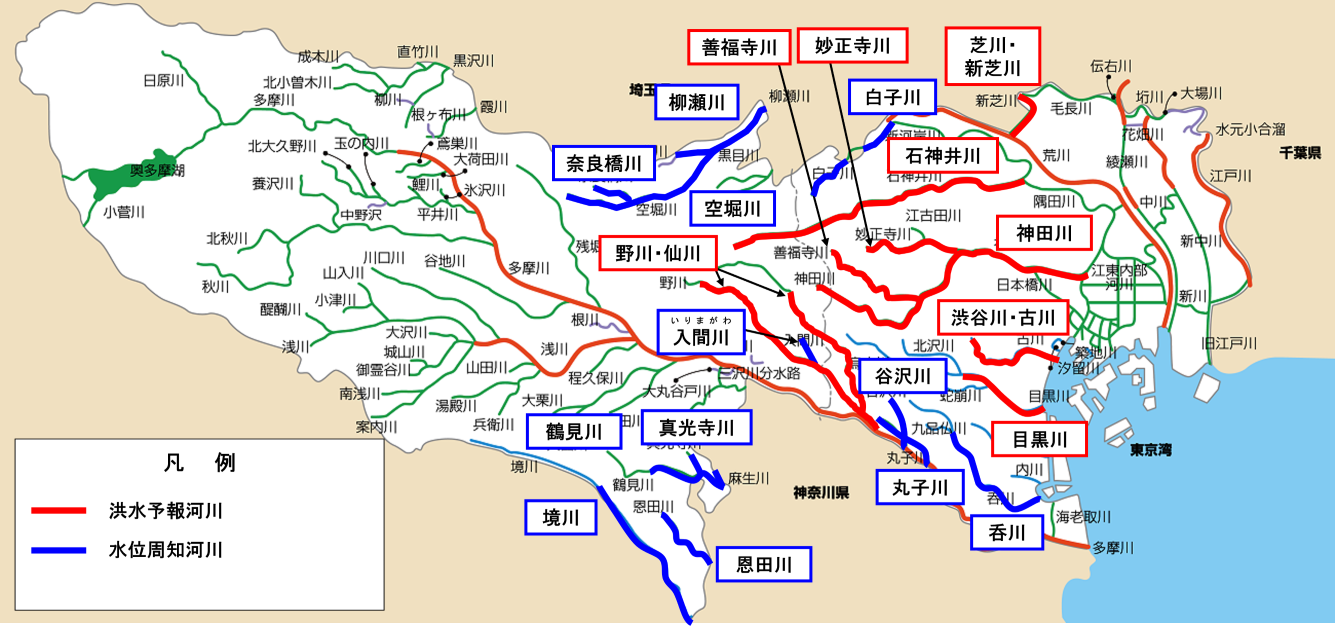 (国管理洪水予報河川:利根川上流部、江戸川、中川、綾瀬川、荒川、入間川(いるまがわ)、多摩川、浅川)