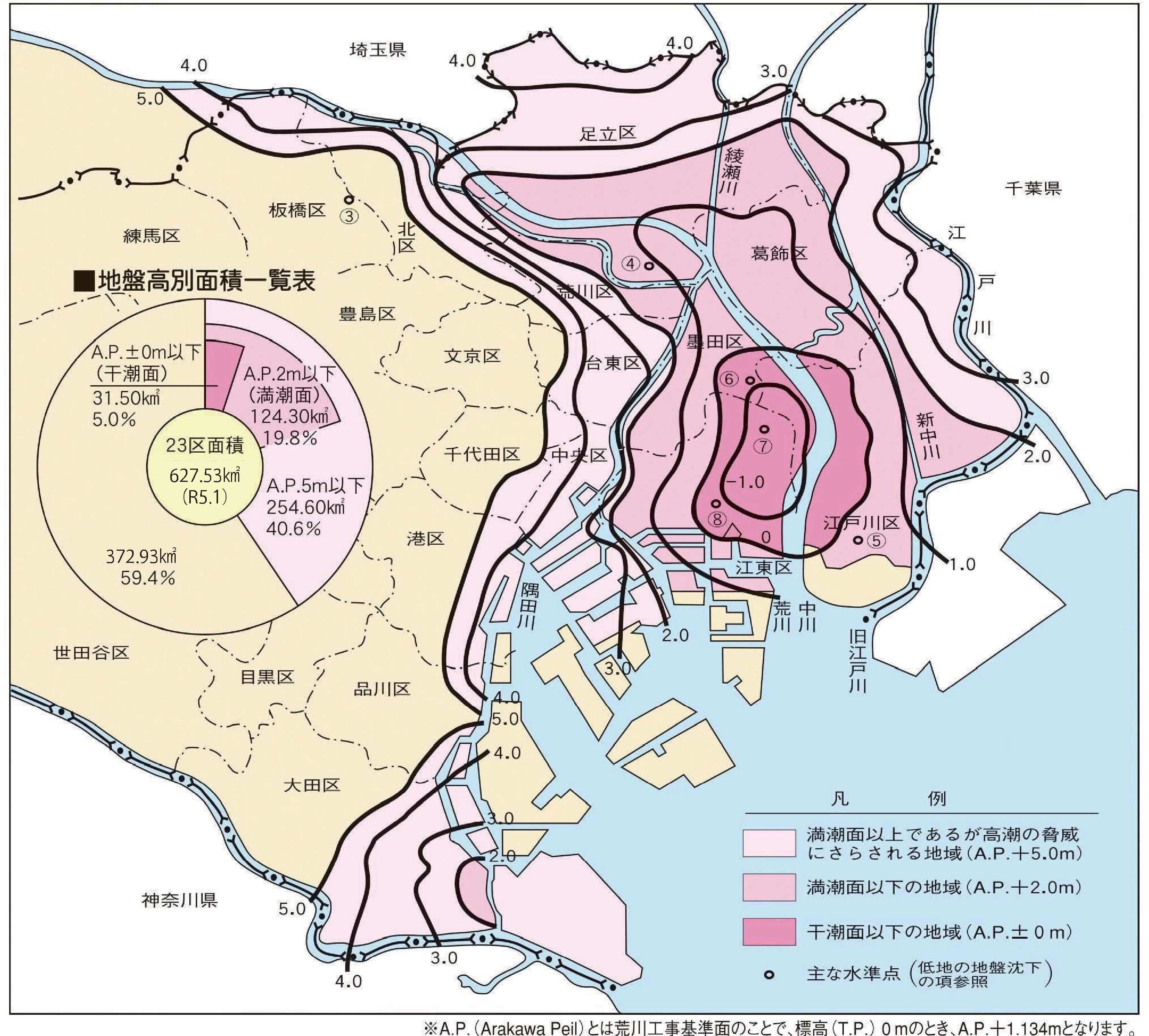 東部低地帯といわれる低地は、沖積層と呼ばれる軟弱な土砂が厚く堆積した地域で、ここには隅田川、荒川、中川などの大きな河川とそれらの支川・派川が縦横に流れています。 元来低地帯であったことに加え、明治期から昭和40年代頃まで産業の発展に伴い地下水の汲み上げが行われ地盤沈下が進行した結果、高潮、洪水、大地震等の自然災害に対する危険性が高い地域となっています。