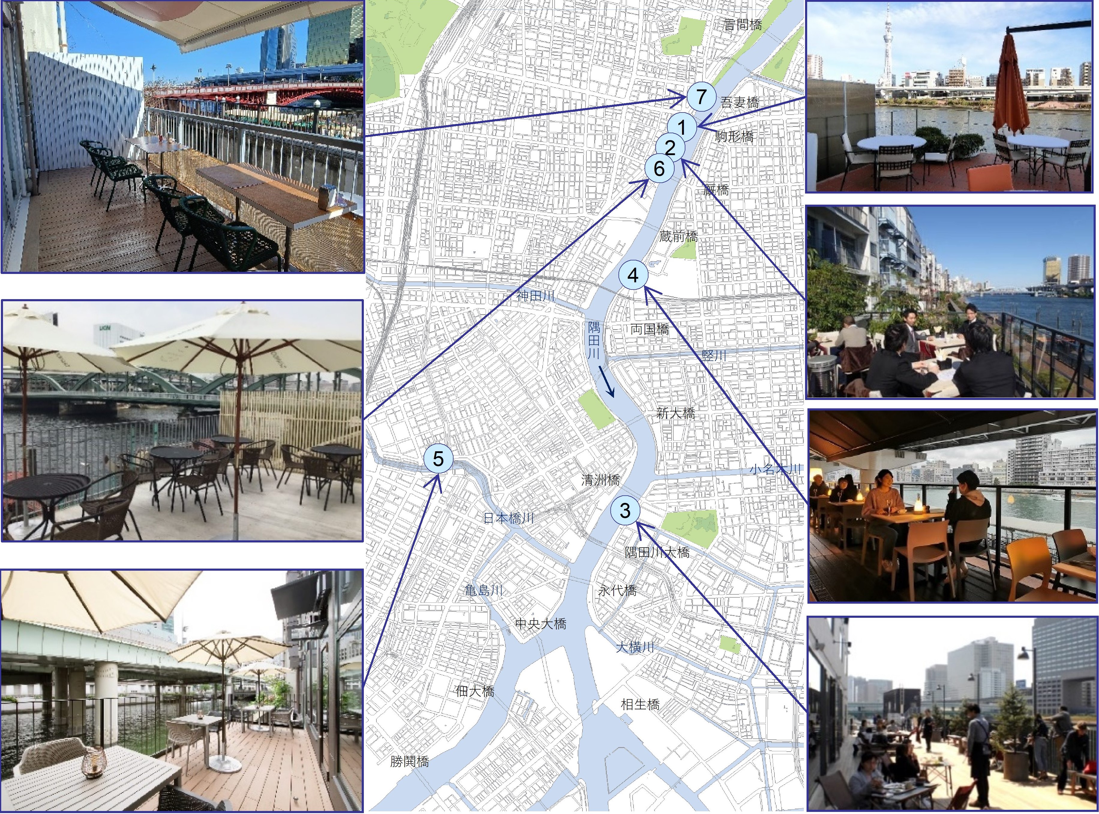 東京都には、隅田川を中心とし7店舗の“かわてらす”が設置されています。各々、立地条件等を活かした特色のある“かわてらす”になっておりますので、ぜひ一度お越しください。