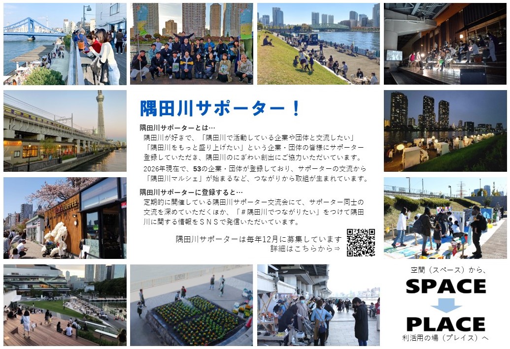 隅田川が好きで、「隅田川で活動したい」「隅田川の活動をもっと応援したい」「隅田川の活動をもっと盛り上げたい」「隅田川で活動している企業や団体と交流したい」という企業・団体の皆様をサポーターとして登録し、一緒に隅田川を盛り上げていく制度です。