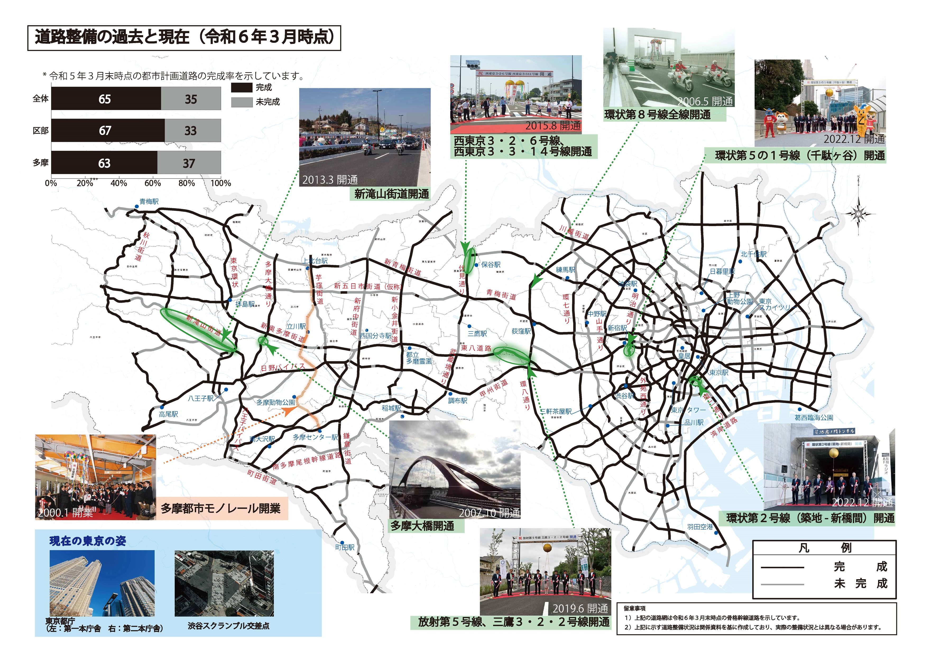 - 都民の暮らしと安全を守るため、市街地では、住環境を向上させ、地域の円滑な交通を確保する幹線道路を、山間や島しょでは、地域住民の生活基盤を強化し、産業の振興を図る道路を整備する。