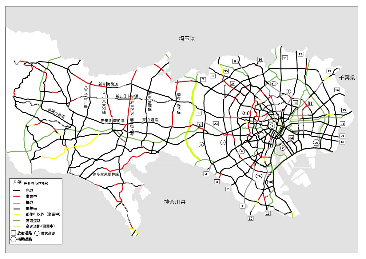区部の重要な道路は、放射・環状型の道路網です。しかし、依然として整備が必要な区間が残っており、交通渋滞が発生しています。そこで、環状方向や区部と多摩を結ぶ幹線道路のうち、まだつながっていない区間を重点的に整備しています。主な整備路線は、放射第7号線(目白通り)、放射第35・36号線、環状第2号線、環状第3号線、環状第5の1号線などがあります。