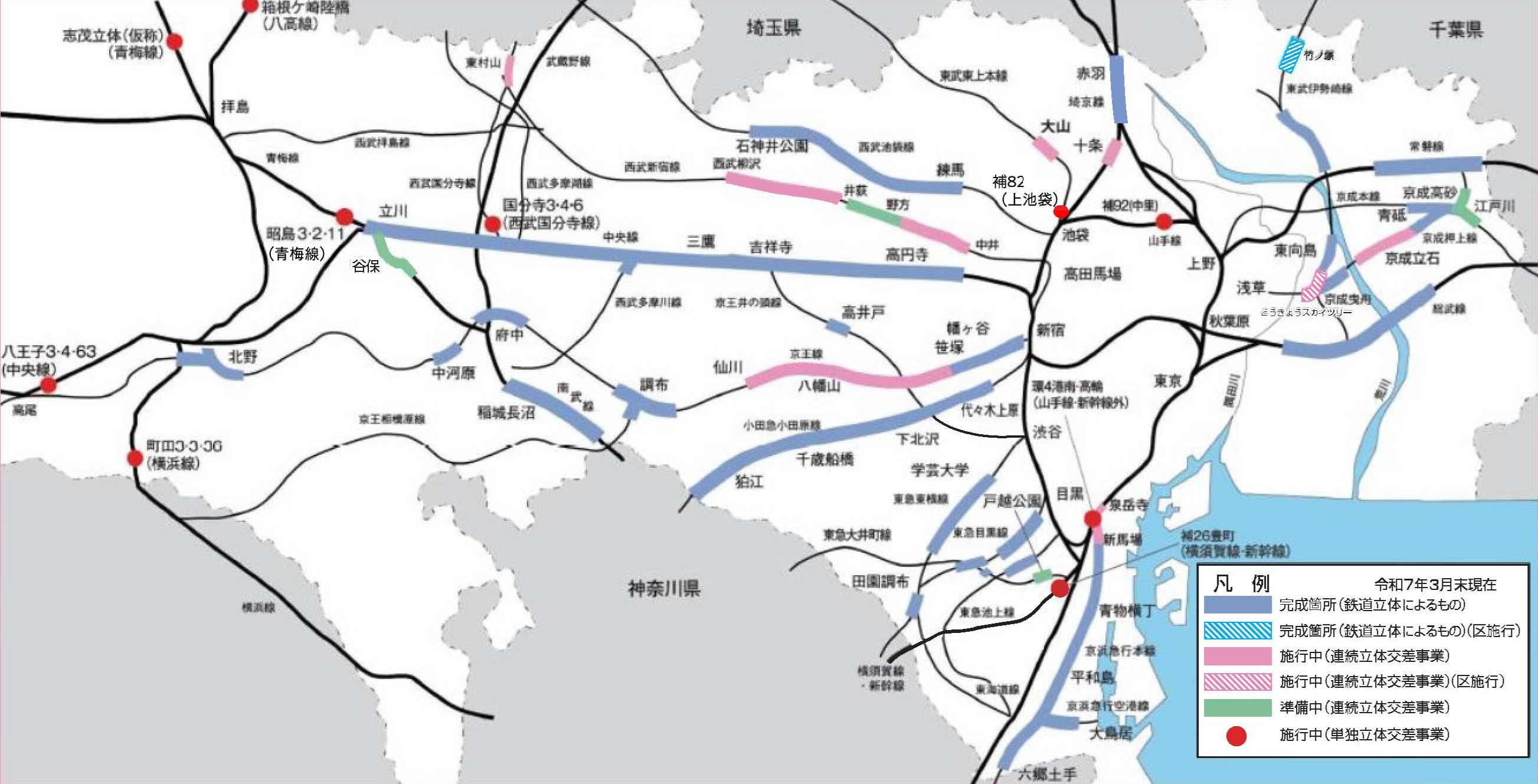 東京都では、踏切による渋滞を解消し、都市の機能や利便性を向上させるため、道路と鉄道の立体交差化を進めています。